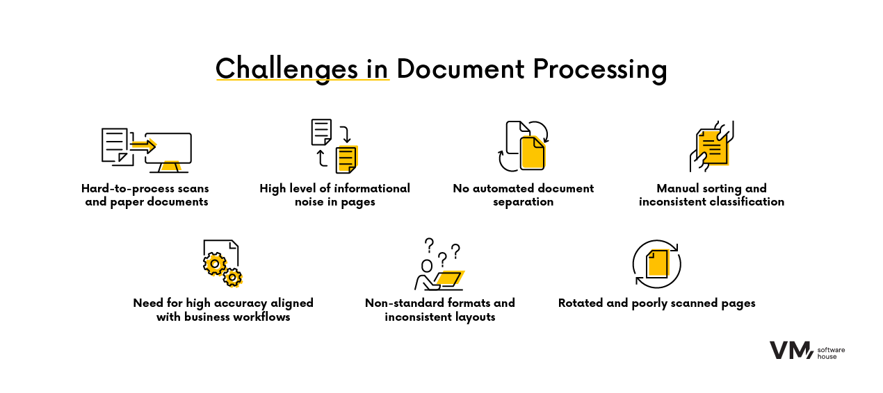The primary goal was to automate the separation and classification of multi-page paper and scanned documents. The solution needed to handle noise (e.g., irrelevant pages, rotated scans, varying layouts) while delivering high accuracy in detecting document boundaries and assigning them to the correct categories. This required advanced image and text processing combined with a deep understanding of the client’s internal business workflows.