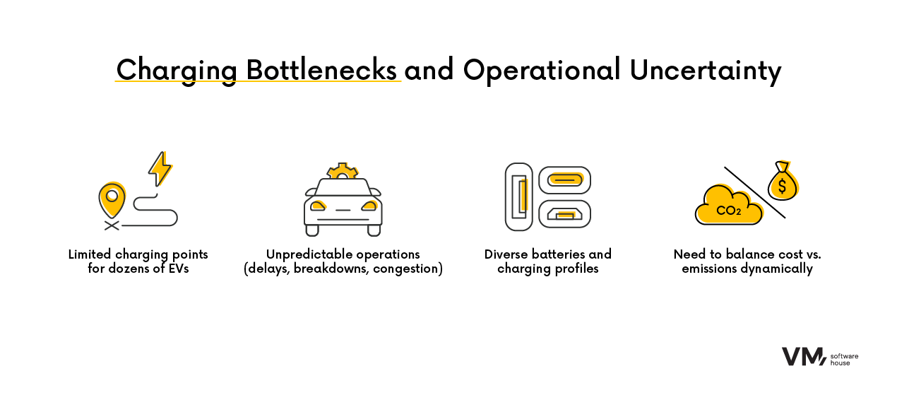 The fleet included several dozen EVs handling hundreds of orders daily. To maintain operational continuity, a system was needed to dynamically and efficiently manage vehicle charging—regardless of disruptions throughout the day.