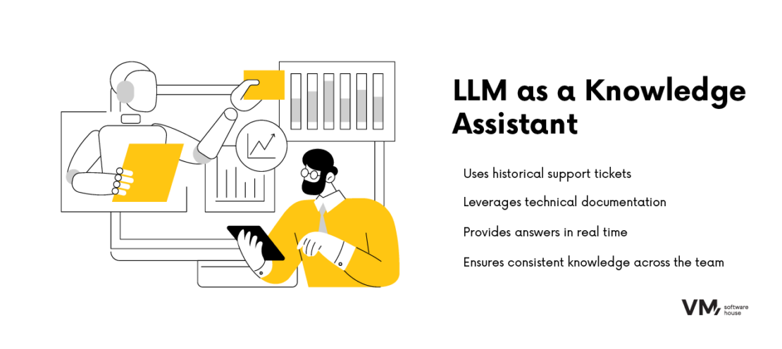 An LLM functions as an intelligent knowledge assistant. Once the data is properly prepared, the model recognizes query context, connects facts, and provides ready-to-use solutions in real time. A single question is enough for the system to locate relevant cases from the ticket archive and documentation, then deliver a precise answer. Every interaction enriches the model, meaning that response quality improves as more cases are processed.